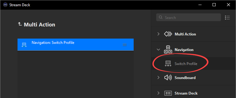 - Drag & drop the Switch Profile action from the right hand navigation bar (located under the Navigation category) below the existing Navigation: Switch Profile action, on the left hand side of the application window.