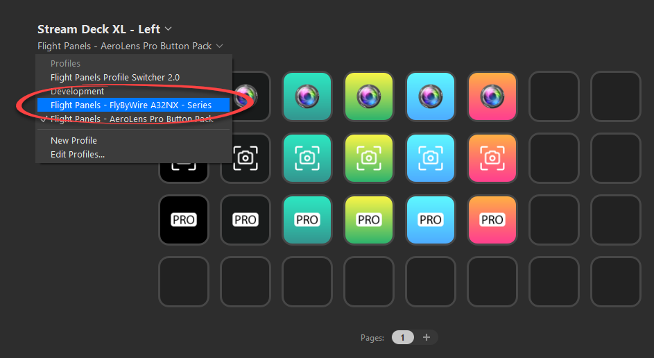 Select the profile that you would like to add the button to, from the profile drop down list within your Stream Deck Application. In this example, we're selecting the 'Flight Panels - FlyByWire A32NX - Series' Stream Deck Profile.